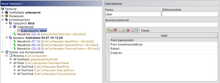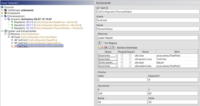 Um diese Komponente zu verwenden, erstellen Sie einen Testschritt im Extrasequenzenbereich mit einer Variable namens „label“ und mit Wert „Rabatt“. Kopieren Sie den Mausklick auf JCarConfigurator.DiscountValue in den Testschritt und ändern Sie die QF-Test ID der Komponente auf „generischesTextField“. Das Ausführen des Mausklicks sollte direkt funktionieren.