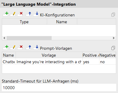 In dieser Tabelle können Sie Vorlagen für LLM-Anfragen vorkonfigurieren, zum Beispiel zur Verwendung mit dem Check Text mit KI. Jede Zeile repräsentiert eine konkrete Vorlage.