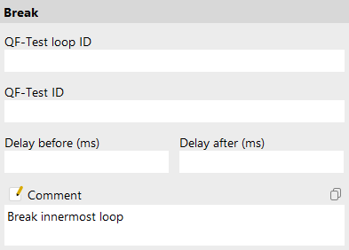 For nested loops you can specify the loop to terminate by specifying the QF-Test ID of a Loop node and refer to it here. It works with QF-Test ID for a While node respectively. In case this field is empty the innermost loop is terminated. In case you want to break an iteration raised by a Data driver node, you should specify the value of the 'Name' attribute of the respective Data driver node.