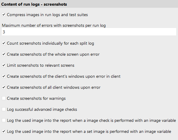 If this option is active, screenshots will also be saved when warnings are logged in the run log. Otherwise this is done for errors and exceptions only.
