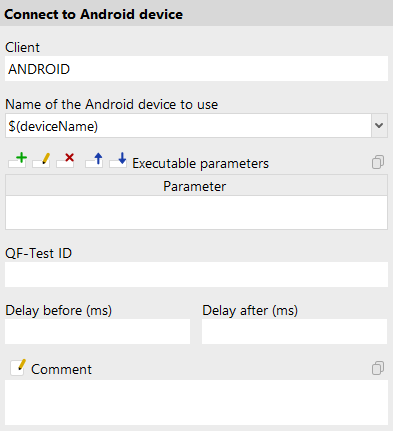 This node is used to make sure that the connection to a virtual or real Android device has been established. If after a configurable timeout, the Android device still has not been connected a ClientNotConnectedException is thrown. If QF-Test detects before the end of the timeout that a connection cannot be established it will throw a ConnectionFailureException.