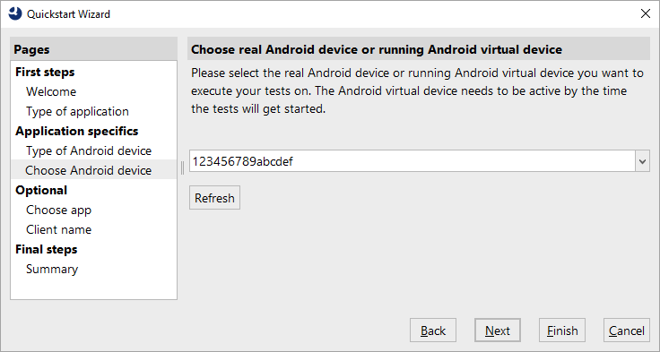 From the Combo box select the shown entry, which is the id of your connected device. Press "Refresh" in case no device is visible. If it is still not visible also try to restart QF-Test in order to make the device visible. Then press "Next".