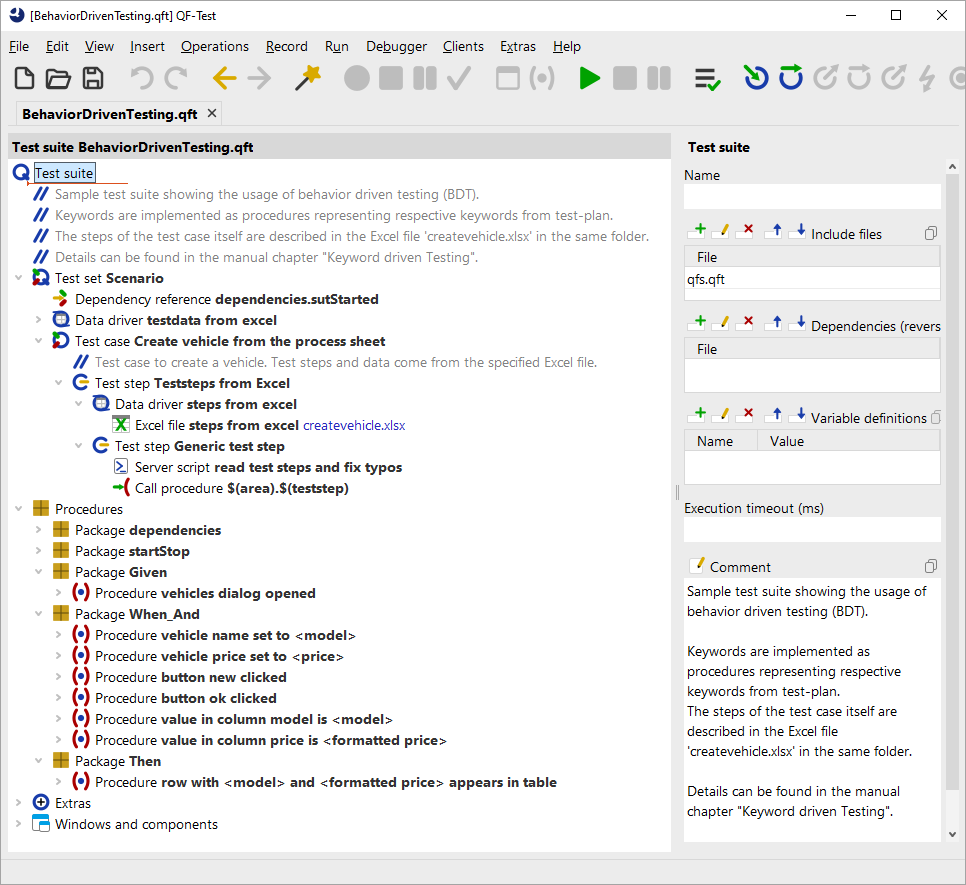 The provided sample test suite contains all procedures in the respective packages, e.g. a procedure vehicles dialog opened inside the package