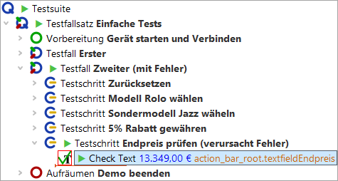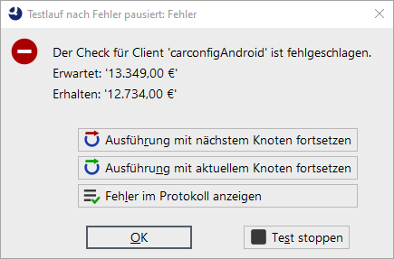QF-Test hält bei dem fehlerhaften Knoten an und wechselt in den Debug-Modus: