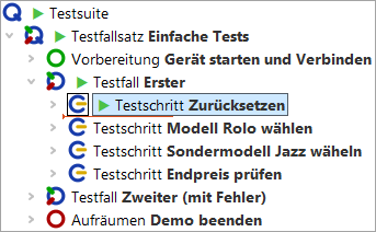 Wenn Sie an dem Punkt weitergemacht haben, an dem die Ausführung der Testsuite im letzten Abschnitt pausiert war, d.h. vom Knoten "Testfall: Erster" aus, so würde nun der Testfall geöffnet werden: