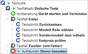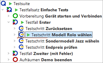 Hinweis Dieses Verhalten tritt nur auf, wenn Sie die komplette Testsuite oder den Testfallsatz gestartet hatten und sich im Debug-Modus befinden. Wenn keine Testausführung aktiv war und Sie nur den Testfall selektiert hatten, so bewirkt die Funktion "Gesamten Knoten ausführen", dass der Testfall ausgeführt wird und dann der nächste Testfall selektiert wird.