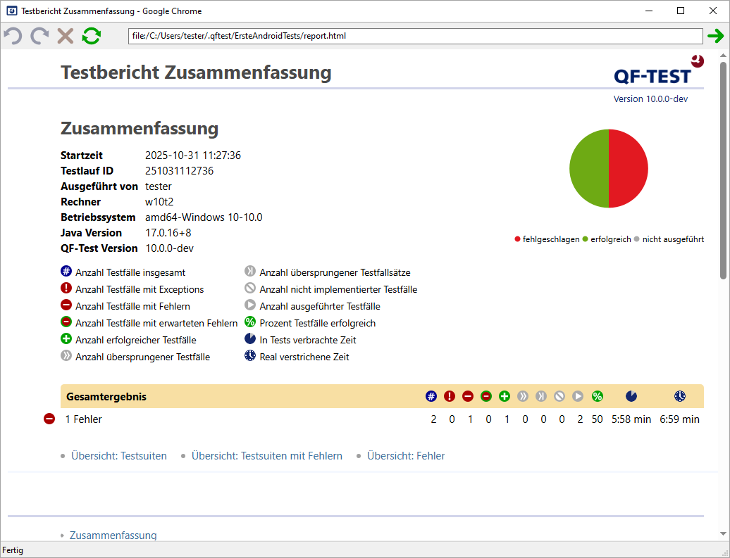 Der Testbericht beginnt mit einer Zusammenfassung mit allgemeinen Systeminformationen im linken Bereich, einer Legende der verwendeten Symbole rechts, einem Überblicks-Tortendiagramm in der Mitte und dem Gesamtergebnis darunter. In unserem Fall bei einem fehlerhaften von zwei ausgeführten Testfällen eine Erfolgsquote von 50%.