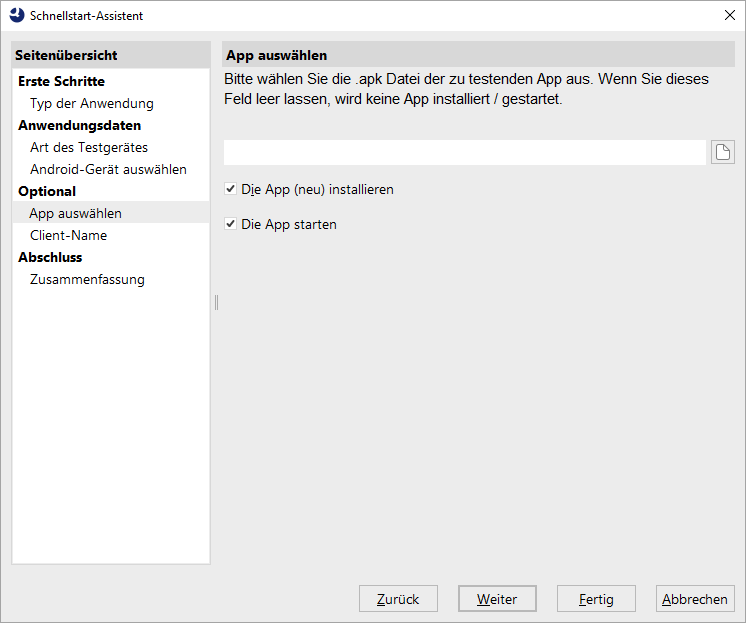 Zu Beginn muss die zu testende mobile Anwendung direkt aus QF-Test heraus gestartet werden. Verwenden Sie dazu den Schnellstart-Assistenten.