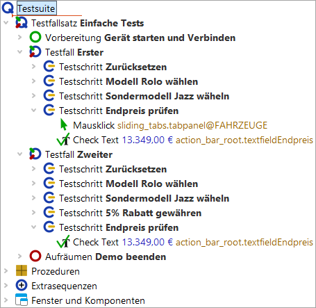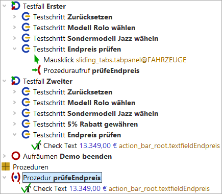 Sehen Sie sich den letzten Testschritt "Endpreis prüfen" in unseren beiden Testfällen an.