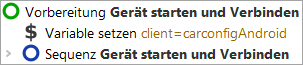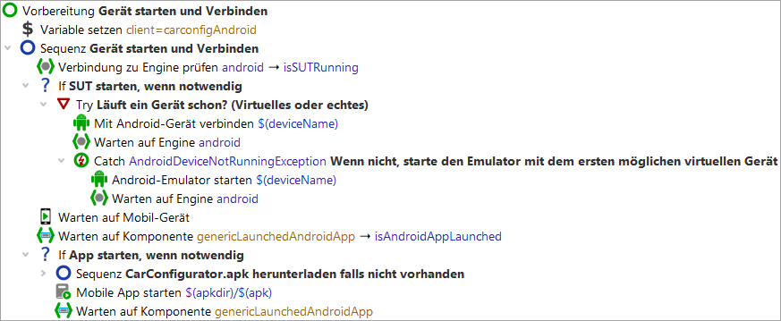 Hinweis: Bei iOS wird der Knoten Mit iOS-Gerät verbinden für die Verbindung zu einem echten iOS-Gerät oder zu einem Simulator verwendet. - Warten auf Mobile-Gerät - stellt die endgültige Verbindung zwischen QF-Test und dem Android-Gerät her und wartet sowohl bei Android als auch bei iOS bis der Verbindungsaufbau abgeschlossen ist.