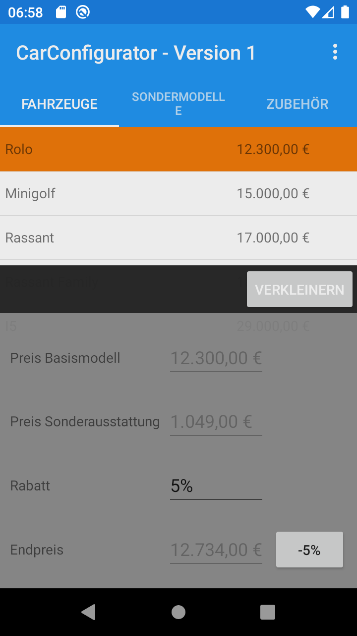 Nach Abschluss der Startsequenz sollte auf dem Android-Gerät die Demo-App "CarConfigurator" erscheinen.