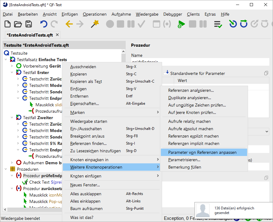 - Aktion Schließen Sie den Dialog "Angepasste Knoten", den QF-Test anzeigt, um Sie über die vervollständigten Knoten zu informieren.