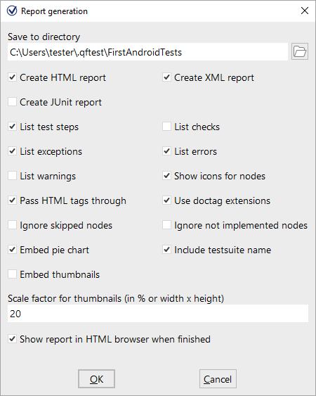 In the first field, you can specify the file name of the report. Following this, you can decide what type of report you want. QF-Test offers three kinds of reports, HTML, XML and JUnit format. An XML report is useful if you want to process the data further, e.g., if you have written your own XSLT stylesheets to shape the report. JUnit reports prove useful when you need to import results into build or test management tools.