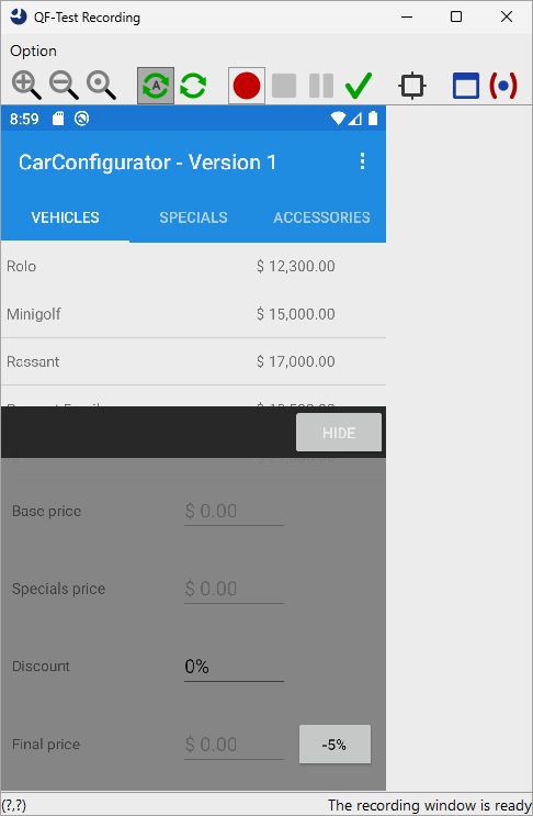 For mobile applications a special recording window is available mirroring the screen of the real device or emulator. This window is necessary because actions cannot be recorded directly on the device or emulator. All interactions are carried out via this recording window and recorded accordingly.