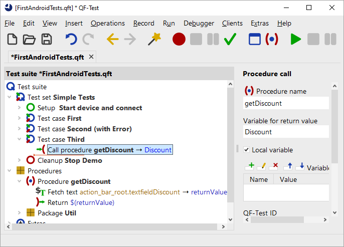 There are a number of nodes that have a Variable definitions table. There, you can set local variables. If the respective node is inside a procedure, the variable is bound as a local variable to the procedure, otherwise as a local variable to the test case. Variables that are bound to the test suite node via this table can be referenced by all nodes in the test suite.