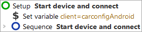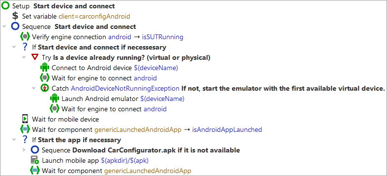 Note: For iOS, the node Connect to iOS device is used to connect to a real device as well as to a simulator. - Wait for mobile device – finalizes the connection to the Android device and for both technologies waits for the connection to be up and running.