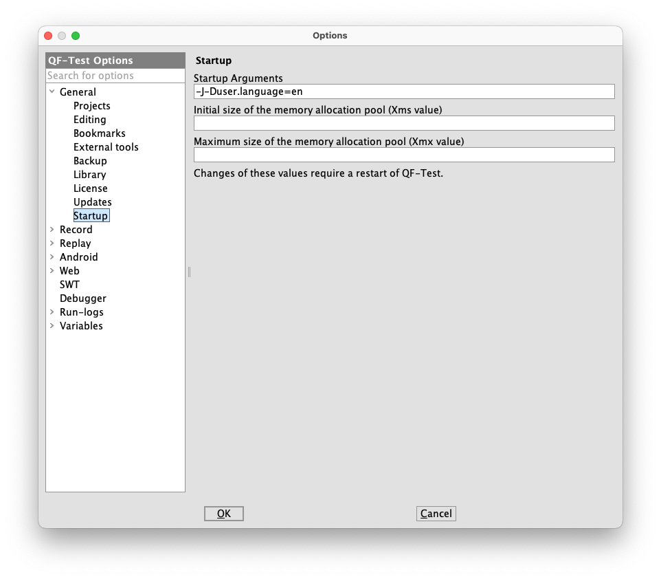 Thats why, in QF-Test for macOS, we have added an additional section in the QF-Test application settings at “General” → “Startup”.
