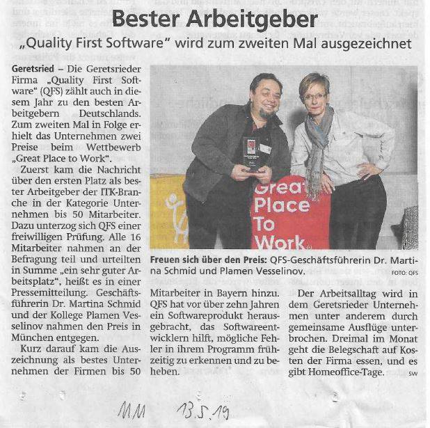 - Geretsrieder Merkur (June 2021): « Top employer comes from Geretsried – Quality First Software (QFS) once again tops the « Great Place to Work » rankings » (German Article only)